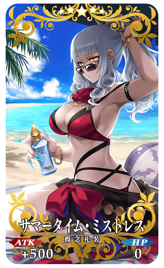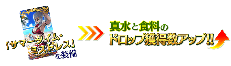 イベントアイテム交換で入手できるイベント限定概念礼装「★5(SSR)サマータイム・ミストレス」を装備すると、真水と食料のドロップ獲得数がアップします。