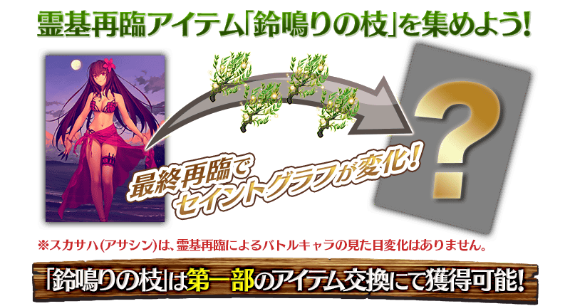 霊基再臨にはイベント限定の専用霊基再臨アイテム「鈴鳴りの枝」が必要です。