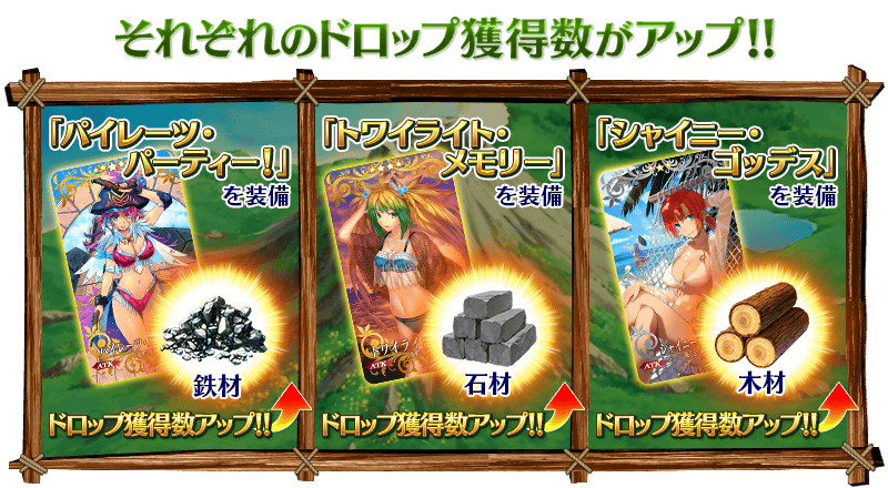 2016年に開催された「夏だ! 海だ! 開拓だ! FGO 2016 Summer ピックアップ召喚2」にて、以下の期間限定概念礼装を入手済みとなる場合は、これらの概念礼装を装備することでも、イベントアイテム「鉄材」「石材」「木材」のドロップ獲得数をアップさせることができます!