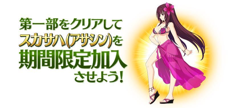 第一部のメインクエストをクリアすることで「★4(SR)スカサハ(アサシン)」が期間限定加入いたします。