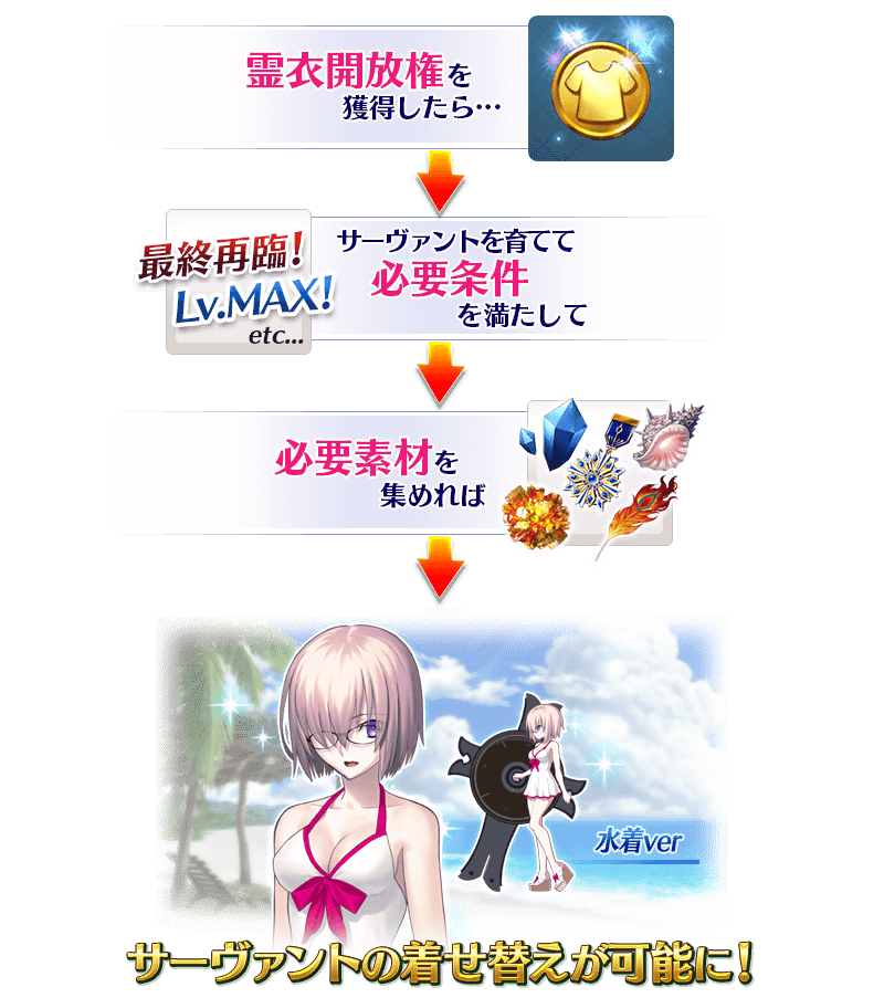 ※「復刻:夏だ! 海だ! 開拓だ! FGO 2016 Summer ライト版」にて霊衣が追加されるサーヴァントはマシュ・キリエライトのみとなります。対象のサーヴァントおよび霊衣については今後のイベントなどで順次追加されます。