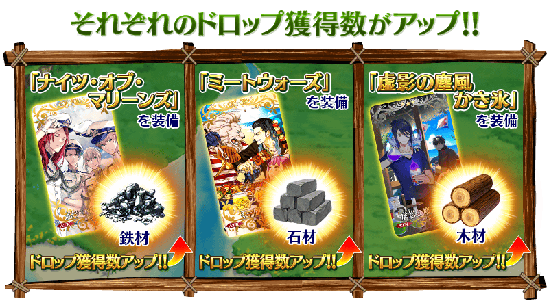期間限定概念礼装を装備することで、イベントアイテム「鉄材」「石材」「木材」それぞれの獲得数がアップします。