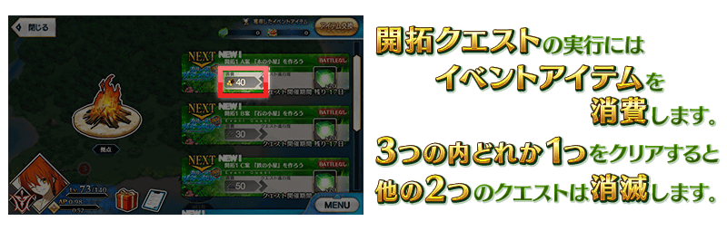開拓クエストの実行には資源(イベントアイテム)を消費します。