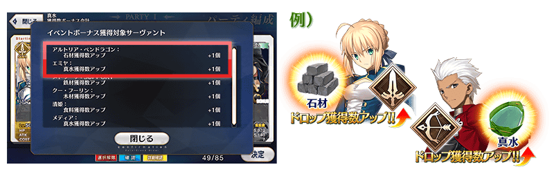 例えば、石材が入手できるクエストの編成にセイバークラスのサーヴァントを加えることで石材の獲得数がアップします。