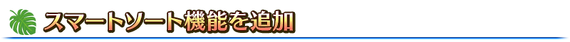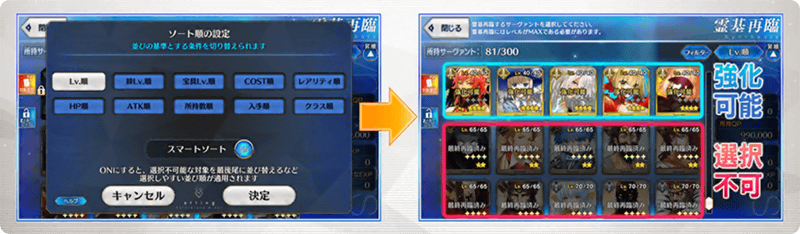 スマートソート機能をONにすることで、強化可能な対象を先頭に移動し、選択不可の対象を最後尾に移動などといった並び替えが可能となります。