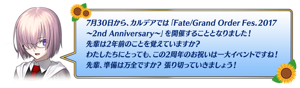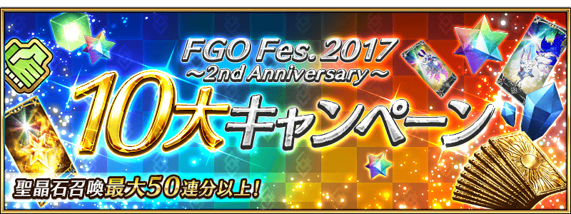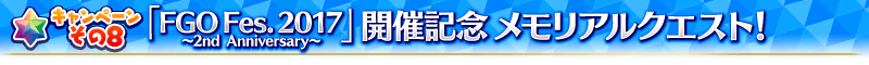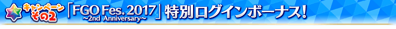 「FGO Fes. 2017 ~2nd Anniversary~」開催を記念した特別なログインボーナスを実施いたします。 ◆キャンペーン開催期間◆ |