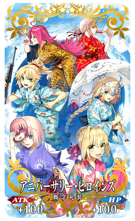 この概念礼装「★4(SR)アニバーサリー・ヒロインズ」は、「レアプリズム交換」から交換したクエストの復活権利を使用し、カルデアゲートに再出現する「FGO夏祭り2016 記念クエスト」をクリアすることでGETできます!
