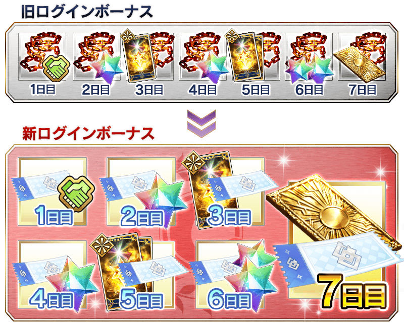 | 7日目 | 聖晶石 7個 フレンドポイント 2,000pt 叡智の大火 ALL★3(R) 10枚 呼符 10枚 黄金の果実 10個 100万QP |