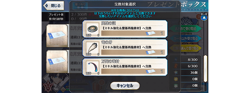 ※プレゼントボックスより月をまたいで前月の「交換券」を受け取った場合、獲得できる素材は、「交換券」に記載されている月の対象素材となります。