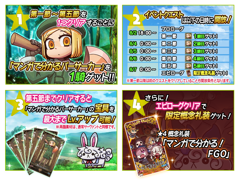 日毎に開放される、期間限定のイベントクエストをクリアして、期間限定サーヴァント「★1(C)マンガで分かるバーサーカー」をゲットしましょう!