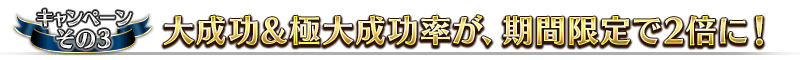 サーヴァントおよび概念礼装の強化を行った際に、大成功(経験値2倍ボーナス)・極大成功(経験値3倍ボーナス)が発生する確率が期間限定で2倍になります。