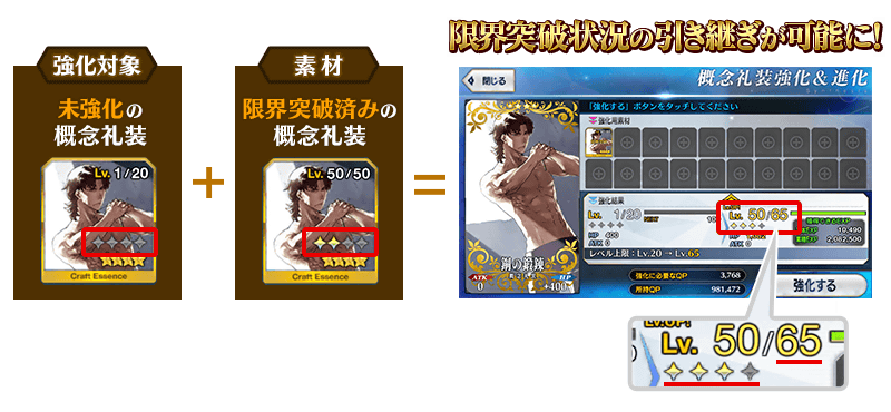 概念礼装強化&進化画面にて、同種の概念礼装を用いて限界突破させるための強化を行う際、素材側に使用した概念礼装の限界突破状況を強化対象となる概念礼装に引き継ぐことが可能となります。