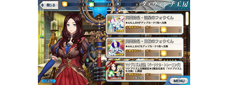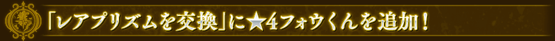ダ・ヴィンチ工房の「レアプリズムを交換」に、「英霊結晶・流星のフォウくんALL★4(HP)」と「英霊結晶・日輪のフォウくんALL★4(ATK)」を追加します。