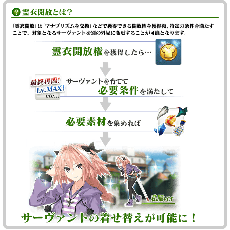 ※「霊衣開放」による変更はサーヴァントの外見のみでクラスやパラメータなどに変化はありません。