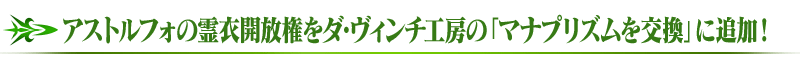 11月8日(水) 18:00よりダ・ヴィンチ工房の「マナプリズムを交換」に新アイテムとして、「★4(SR)アストルフォ」の霊衣開放権が追加されます!