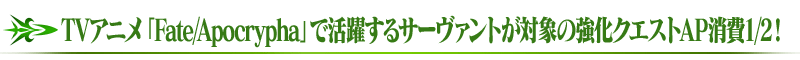 TVアニメ「Fate/Apocrypha」で活躍するサーヴァントを対象に、強化クエストのAP消費量が期間限定で1/2となります。