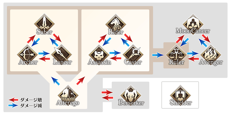 「アルターエゴ」は、「ライダー」「キャスター」「アサシン」に対して有利なクラスとなり、「セイバー」「アーチャー」「ランサー」に対して不利なクラスとなります。