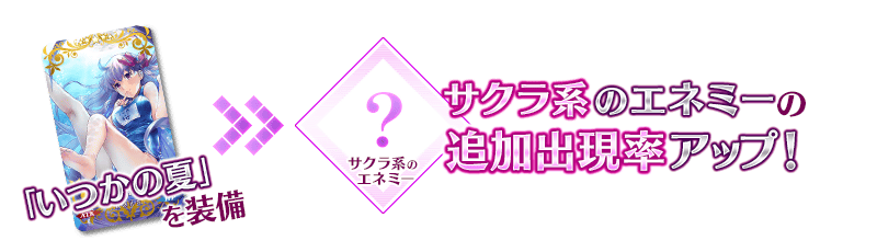 イベント限定概念礼装「いつかの夏」を装備することで、イベント専用アイテムをドロップするサクラ系エネミーの追加出現率がアップします。