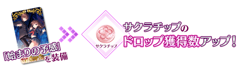 また、イベントアイテム交換にて入手できるイベント限定概念礼装「始まりの予感」を装備すると、イベントアイテム「サクラチップ」のドロップ獲得数がアップします。