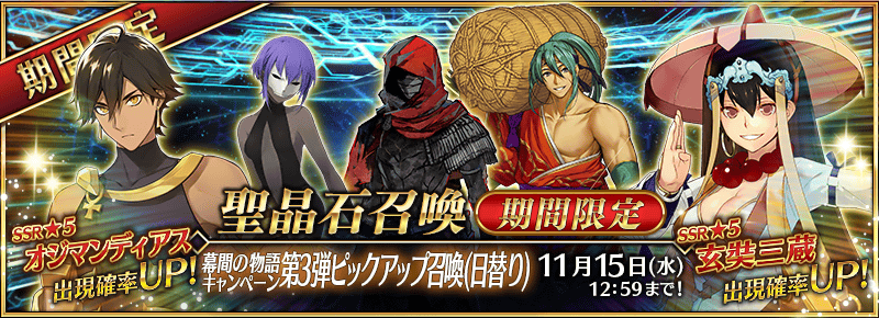 ※オジマンディアス、玄奘三蔵、エミヤ〔アサシン〕、俵藤太、静謐のハサンはピックアップ期間終了後もストーリー召喚にて排出されます。