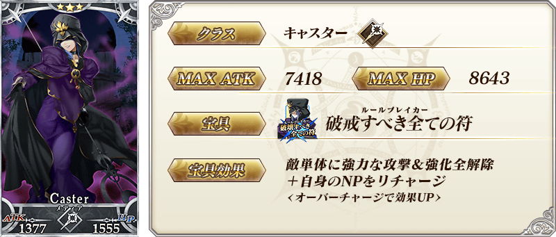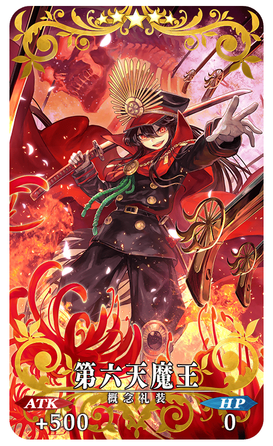 ★★★★★SSR 第六天魔王 ATK 500(最大:2000) HP 0 スキル 自身のBusterカード性能を15%アップ&宝具威力を15%アップ + 小判のドロップ獲得数を1個増やす【『ぐだぐだ明治維新』イベント期間限定】 ![]() |