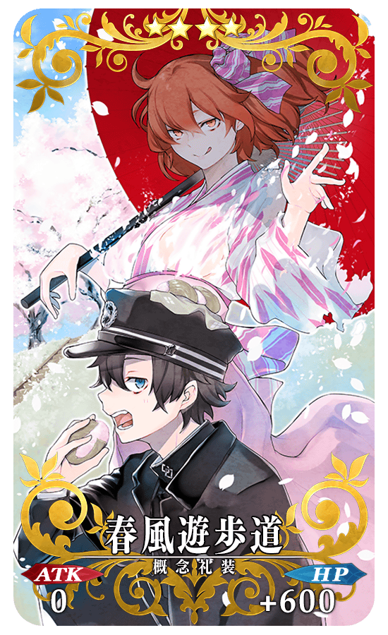 期間限定概念礼装「★5(SSR)第六天魔王」「★4(SR)春風遊歩道」「★3(R)社交界の華」は装備することでイベント専用アイテムのドロップ獲得数がアップいたします。