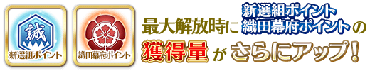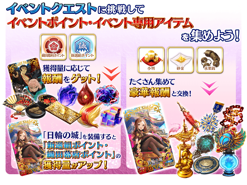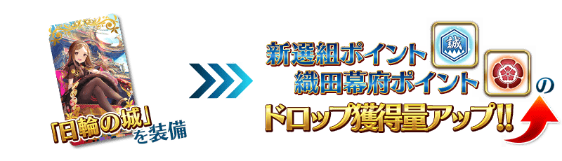 イベントアイテム交換にて入手できるイベント限定概念礼装「日輪の城」を装備することで「新選組ポイント」「織田幕府ポイント」のドロップ獲得量がアップします。