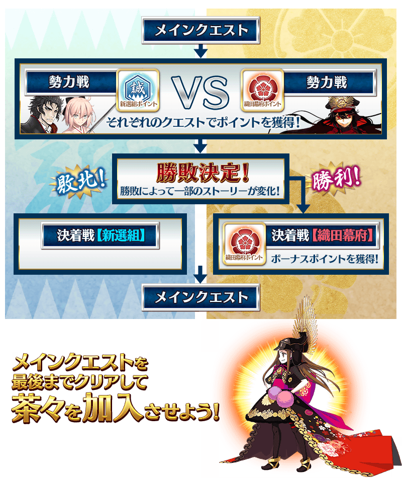 ※第3戦終了後は、メインクエストを最後までクリアすることで、引き続き「新選組ポイント」「織田幕府ポイント」が獲得できるフリークエストが開放されます。