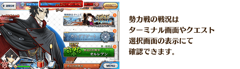 このイベントでは、メインクエストを進行することで、2つの勢力に分かれて競う「勢力戦」が発生します。