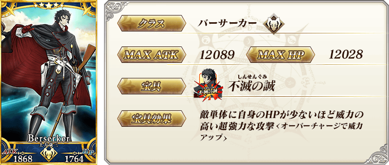 ★★★★★SSR 壬生狼 ATK 500(最大:2000) HP 0 スキル 自身のQuickカード性能を8%アップ&Busterカード性能を8%アップ&毎ターンスターを3個獲得する状態を付与 + ぐだぐだ明治維新において、味方全体(控え含む)の攻撃の威力を50%アップ【『ぐだぐだ明治維新』イベント期間限定】