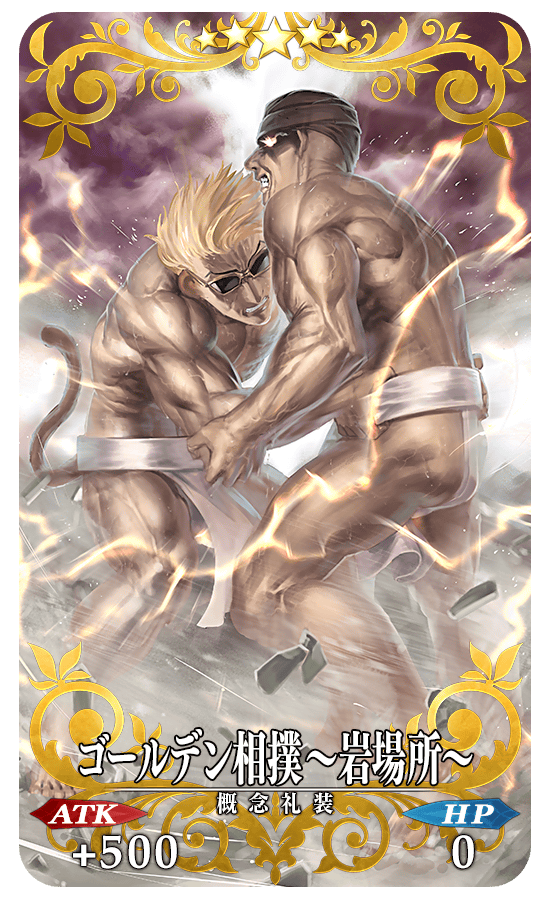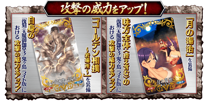 イベントアイテム交換やダメージポイント報酬にて入手できるイベント限定概念礼装「ゴールデン相撲~岩場所~」を装備すると、「復刻:天魔御伽草子 鬼ヶ島 ライト版」における自身の攻撃の威力がアップします。