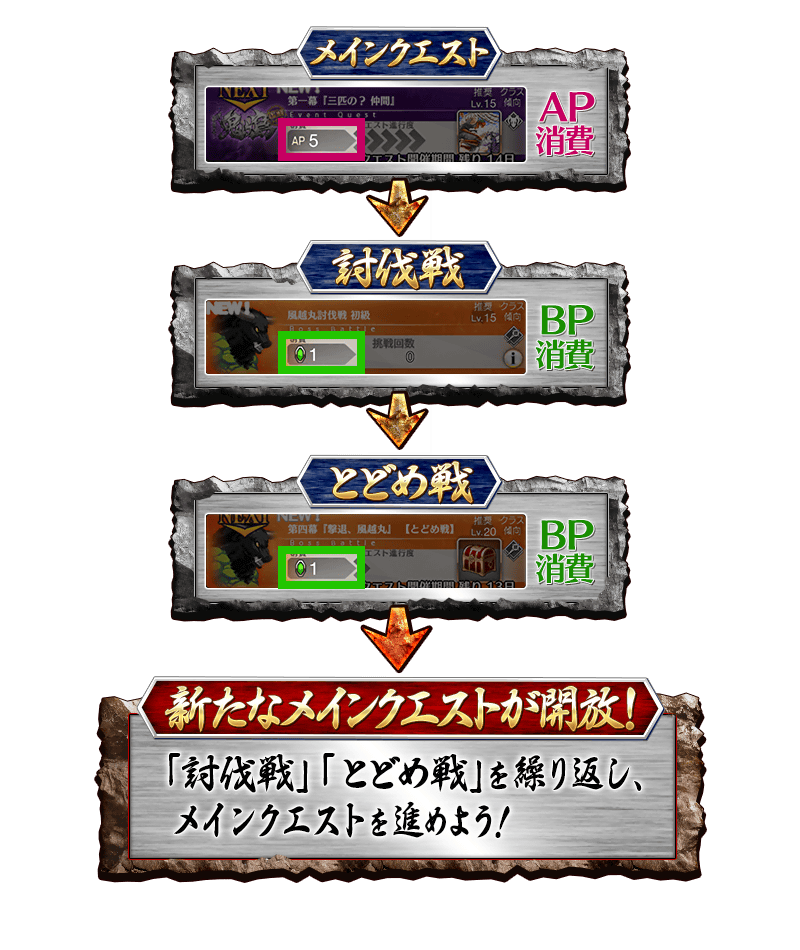 このイベントでは、メインクエストの進行にあわせて討伐戦が発生していき、討伐に成功すると次の新しいメインクエストが開放されます。