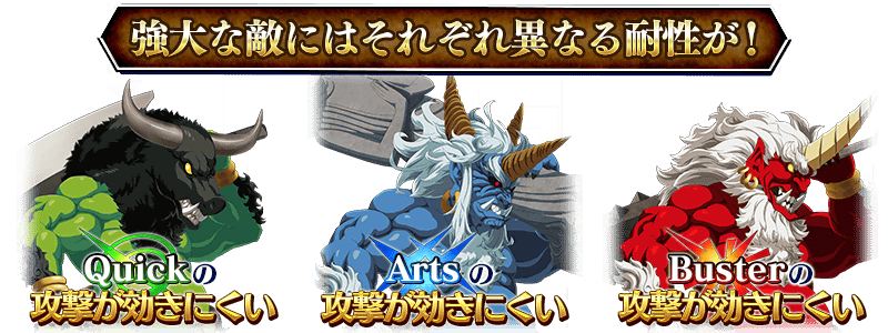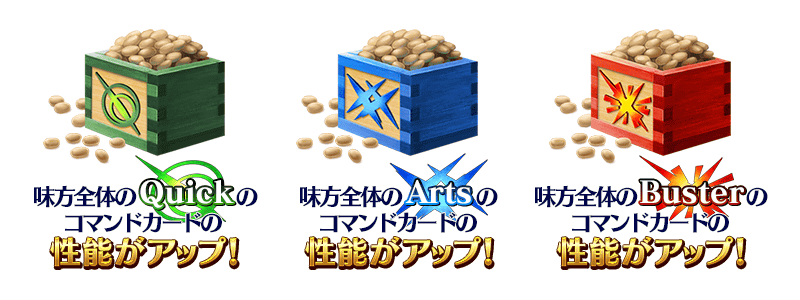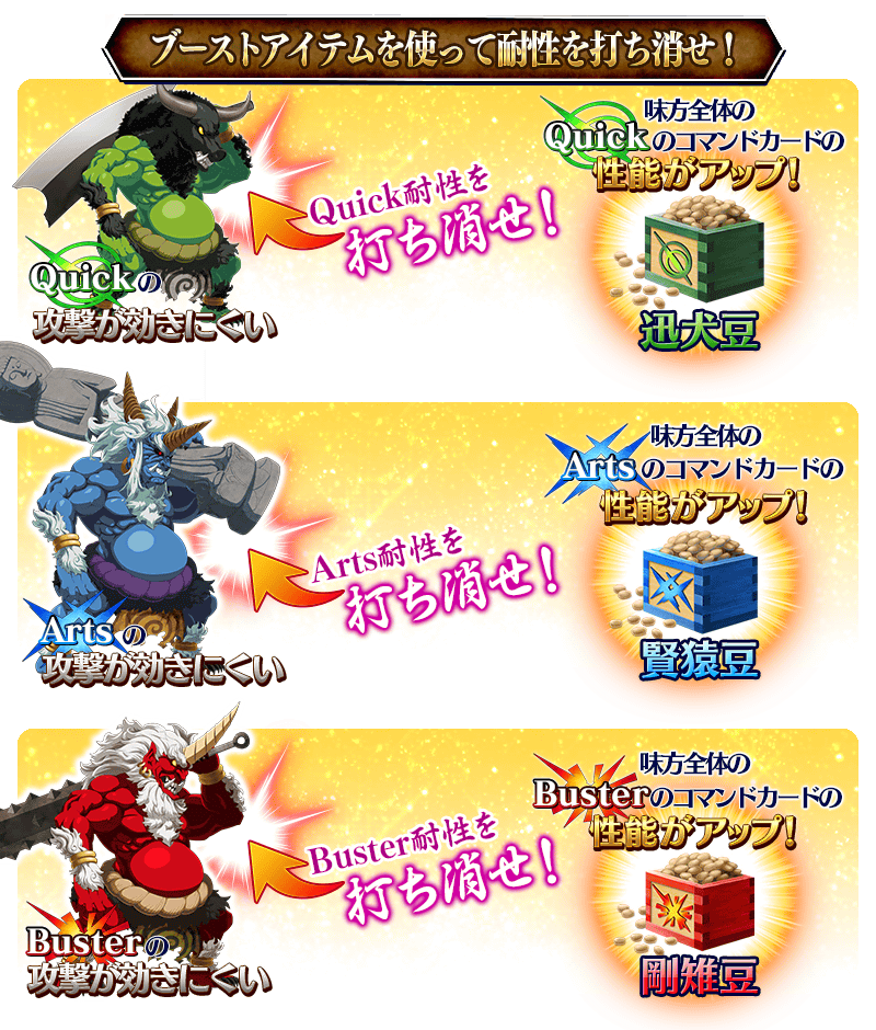 イベントアイテム交換やクエスト報酬などで獲得できるブーストアイテム「迅犬豆」「賢猿豆」「剛雉豆」を使用すると、討伐戦において、味方全体の「Quick」「Arts」 「Buster」それぞれのコマンドカードの効果がアップします。