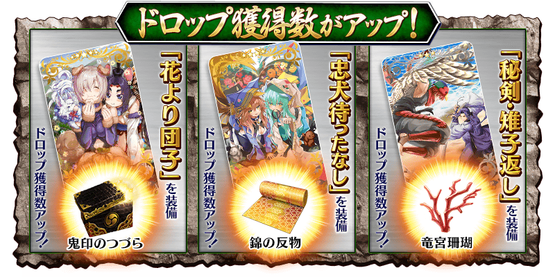 期間限定概念礼装「★5(SSR)花より団子」「★4(SR)忠犬待ったなし」「★3(R)秘剣・雉子返し」は装備することでイベント専用アイテムのドロップ獲得数がアップいたします。