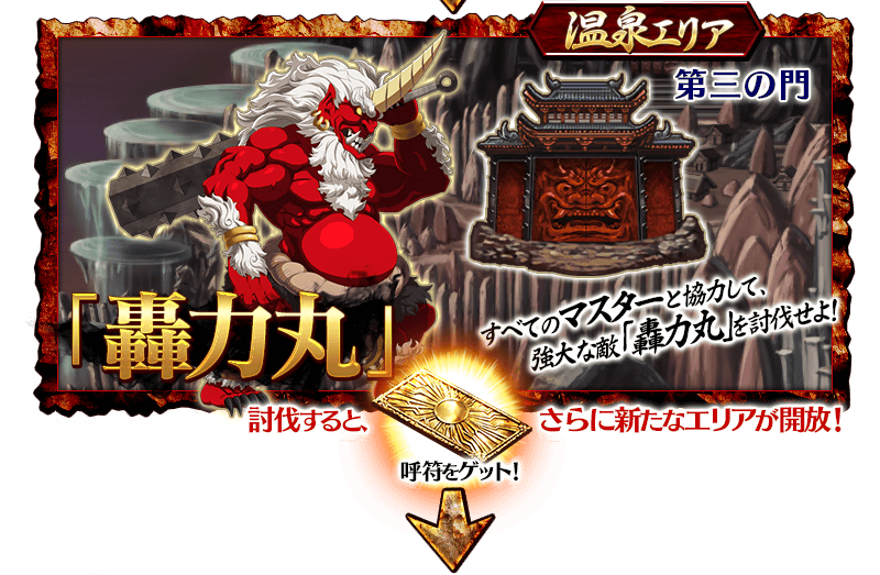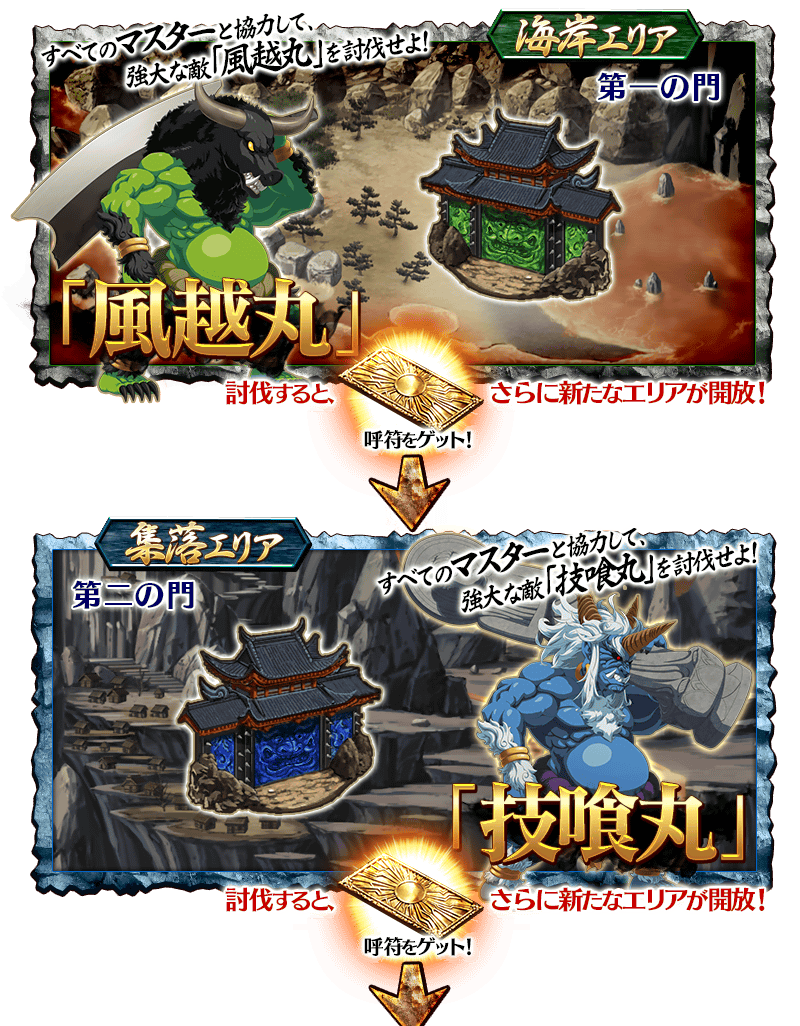 「風越丸」「技喰丸」「轟力丸」ら強大な敵は、一度討伐されたあと「???」討伐後に再登場いたします。