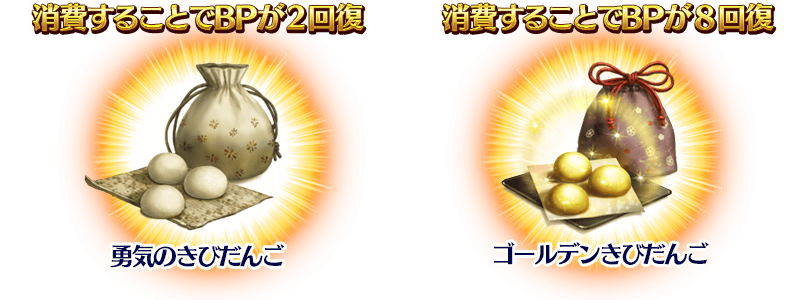 BPは1時間に1回復するほか、クエスト報酬などで獲得できる「勇気のきびだんご」「ゴールデンきびだんご」を使用することで回復させることができます。