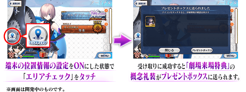 通信の状態が不安定な場合や、「位置情報」の設定がOFFに設定されている場合は、「劇場来場特典」の概念礼装が上手く入手できない場合がございます。※11/7 18:00修正