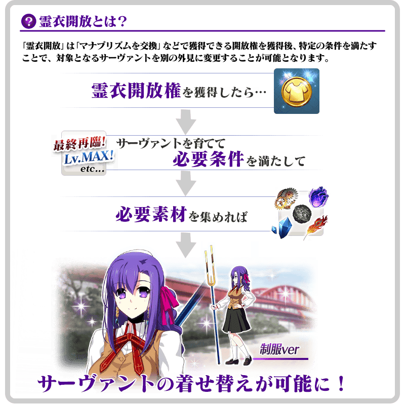 ※「霊衣開放」による変更はサーヴァントの外見のみでクラスやパラメータなどに変化はありません。