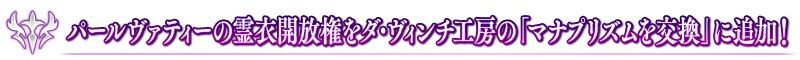 10月8日(日) 13:00よりダ・ヴィンチ工房の「マナプリズムを交換」に新アイテムとして、「★4(SR)パールヴァティー」の霊衣開放権が追加されます!