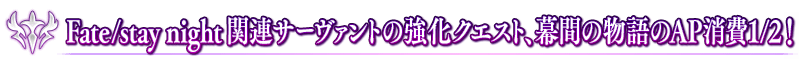 劇場版「Fate/stay night [Heaven's Feel]」公開を記念して、Fate/stay night関連サーヴァントの強化クエストおよび幕間の物語のAP消費量が、期間限定で1/2になります!