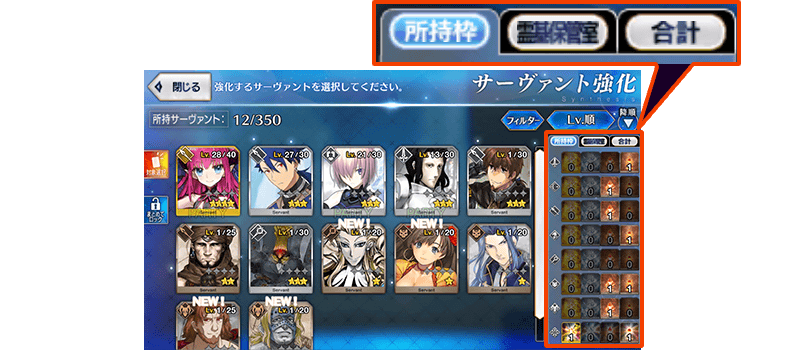 所持枠と、霊基保管室にある強化素材の合計枚数を表示します。