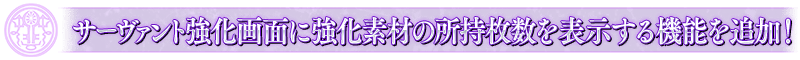 サーヴァント強化画面において、所持している強化素材の枚数をクラスごとに表示できるようにいたします。