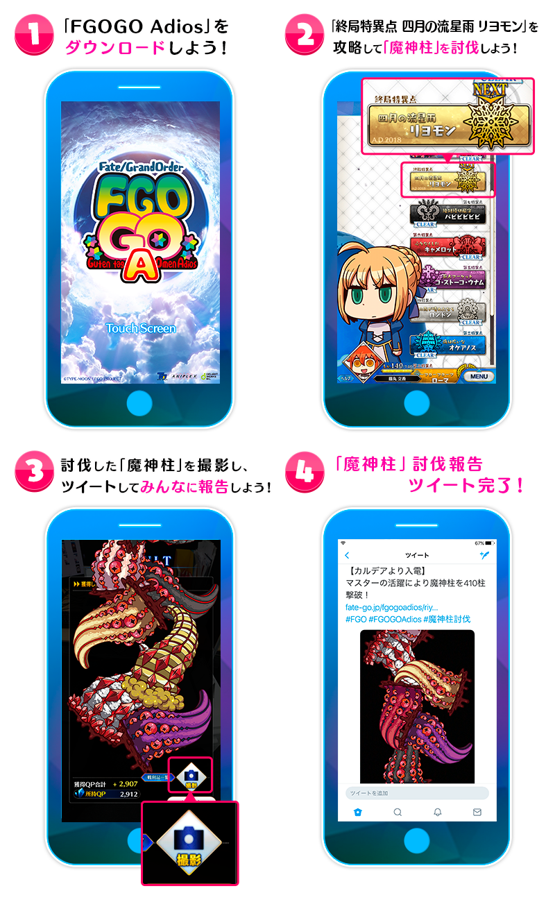 「魔神柱」を討伐したあとにおこなえる「討伐報告ツイート(ハッシュタグ#魔神柱討伐)」の投稿合計数が、4月1日(日) 23:59より前に42,000を越えることができた場合のみ、クリア可能となります。