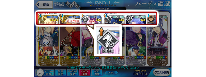 クエスト開始前のサポート選択画面、パーティ確認画面、サーヴァント選択画面において、選択したクエストの「エネミーのクラス傾向」に対するクラス相性を、サーヴァントごとにアイコンで表示するようにいたします。
