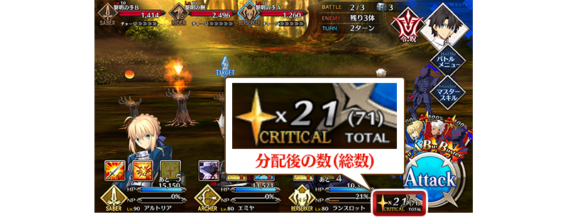 バトル画面において、所持しているクリティカルスターの総数を表示するようにいたします。総数はコマンドカードに分配されているクリティカルスターの数を含めたものとなります。