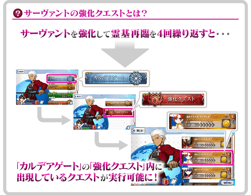 ※強化クエストが開放済みのサーヴァントであっても、対象となるサーヴァントを所持していない場合、クエストは出現しません。