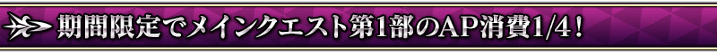 現在、永続的に開催しているAP消費量1/2の状態に、さらにAP消費量1/2を追加して、期間限定でメインクエスト第1部(特異点Fから終局特異点まで)のAP消費量が1/4になります!