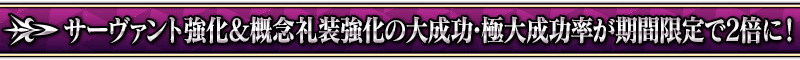 サーヴァントおよび概念礼装の強化をおこなった際に、大成功(経験値2倍ボーナス)・極大成功(経験値3倍ボーナス)の発生確率が期間限定で2倍になります。