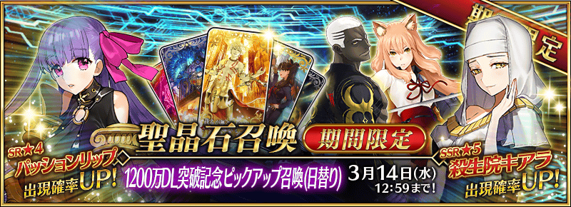 「★4(SR)鈴鹿御前」「★4(SR)エミヤ〔オルタ〕」「★4(SR)パッションリップ」を日替りでピックアップ、「★5(SSR)殺生院キアラ」を常時ピックアップいたします。