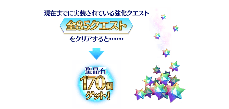 ※なお、すでに強化クエストをクリアし、過去分の報酬を受け取っている場合は、今回より変更となった追加分の聖晶石を、強化クエストクリア数に応じてまとめて獲得することができます。
